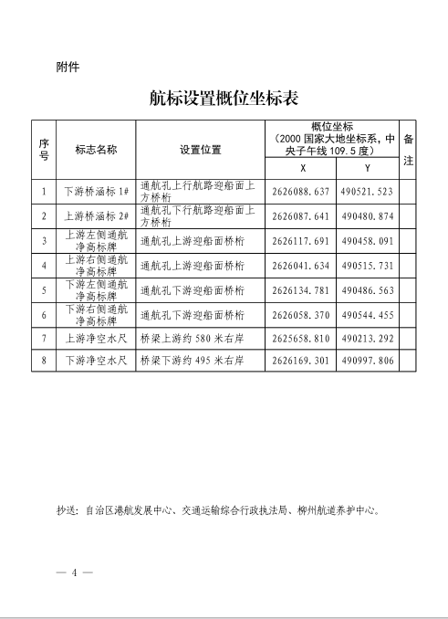 (一)航标设置应与桥梁建成同步,验收应邀请自治区交通运输综合行政执法局第三支队、柳州航道养护中心等机构共同参与,通过后向柳州航道养护中心报送启用前资料,由其发布航道通告后启用。