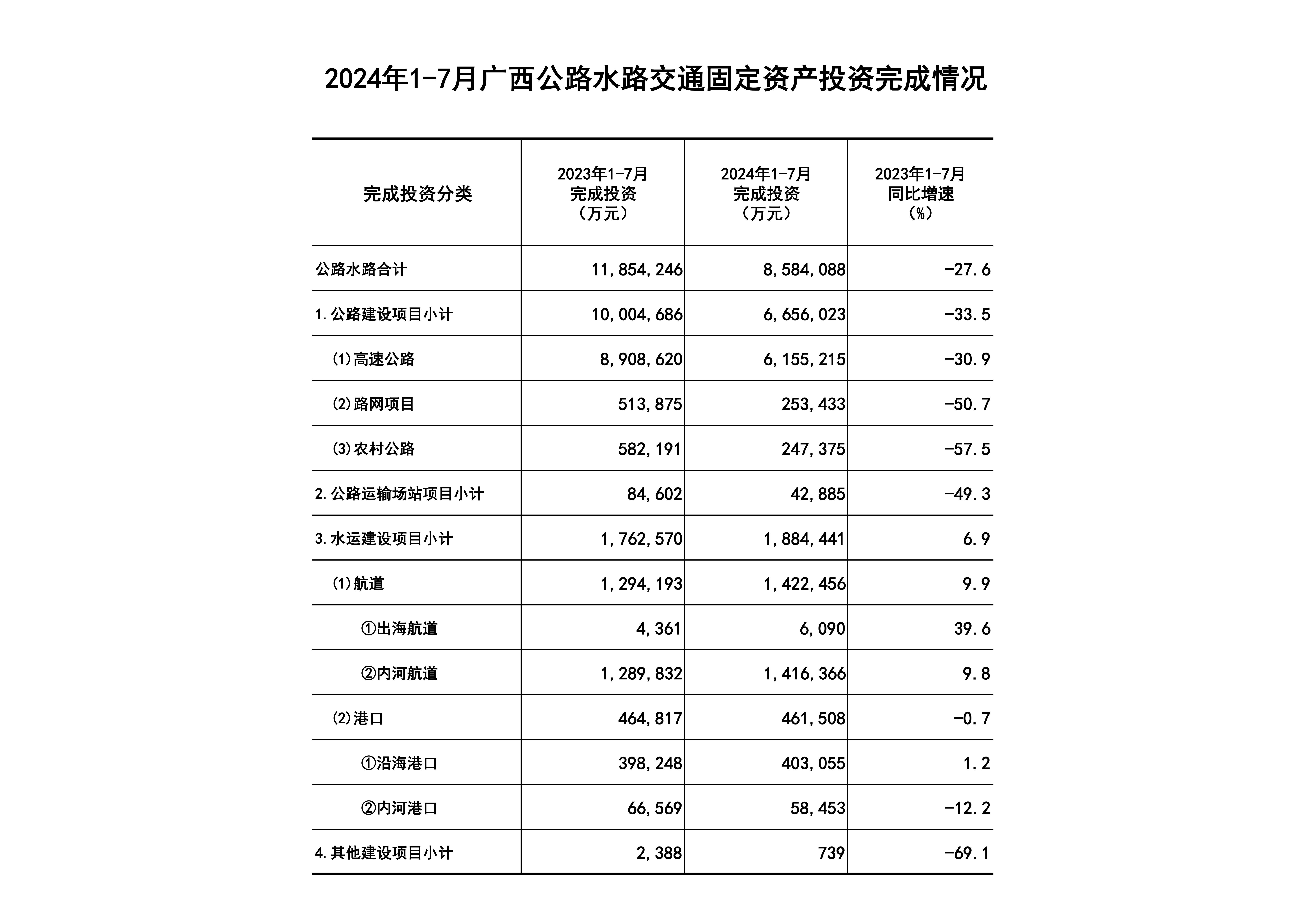 2024年1-7月广西公路水路交通固定资产投资完成情况