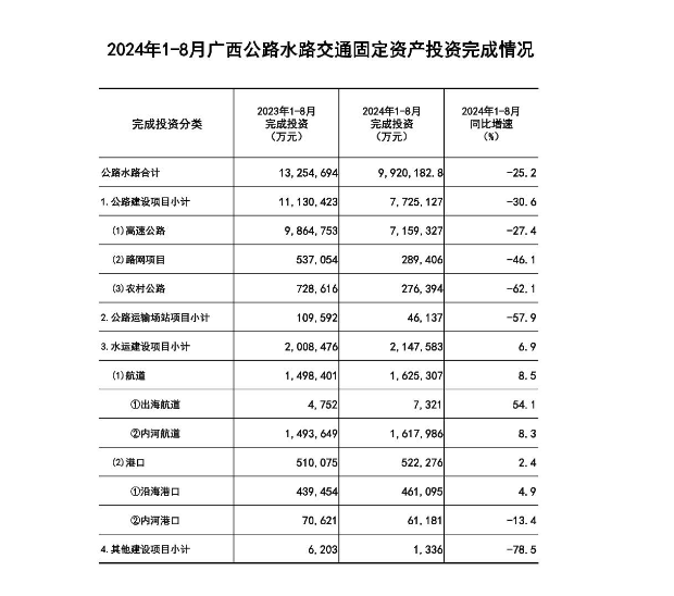 2024年1-8月广西公路水路交通固定资产投资完成情况