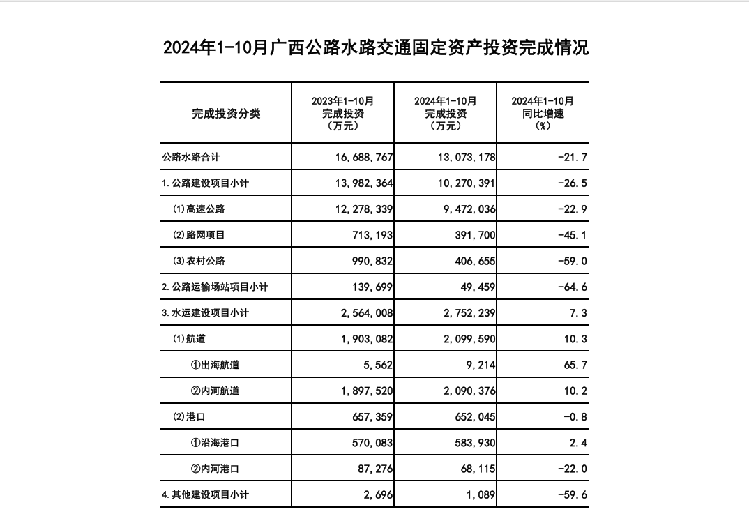 2024年1-10月广西公路水路交通固定资产投资完成情况